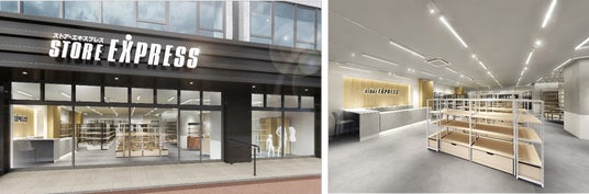 (画像左)店舗ファサードイメージパース (画像右)内装イメージパース ※実際は、物販商品を陳列します。