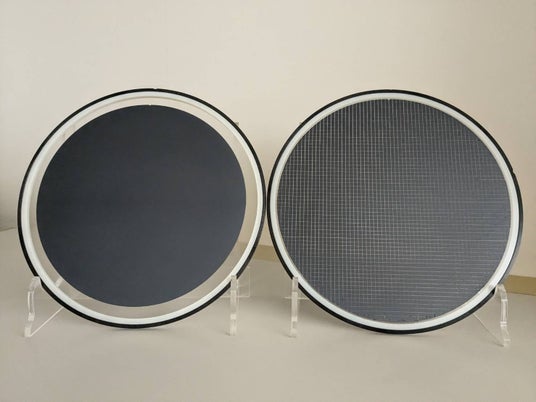 ダイヤモンド電子舌センサーの心臓部であるボロンドープダイヤモンド電極の12インチ基板と5mm□にチップ化したもの