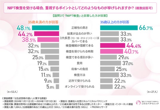 続いて「NIPT検査を受ける場合、重視するポイントとしてどのようなものが挙げられますか?(複数回答可)」と質問したところ、35歳未満の方と35歳以上の方で以下のような回答になりました。