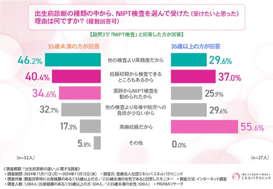 「出生前診断の種類の中から、NIPT検査を選んで受けた(受けたいと思った)理由は何ですか?(複数回答可)」と質問したところ、35歳未満の方と35歳以上の方で以下のような回答になりました。