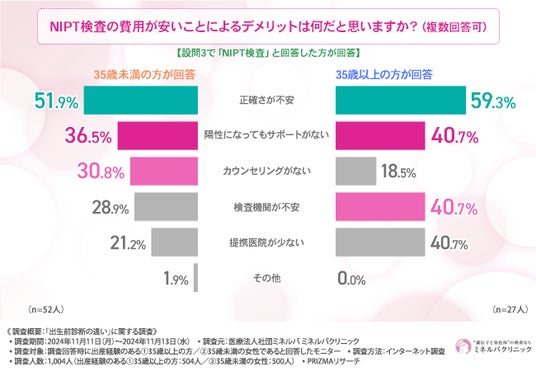 最後に「NIPT検査の費用が安いことによるデメリットは何だと思いますか?(複数回答可)」と質問したところ、35歳未満の方と35歳以上の方で以下のような回答になりました。