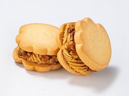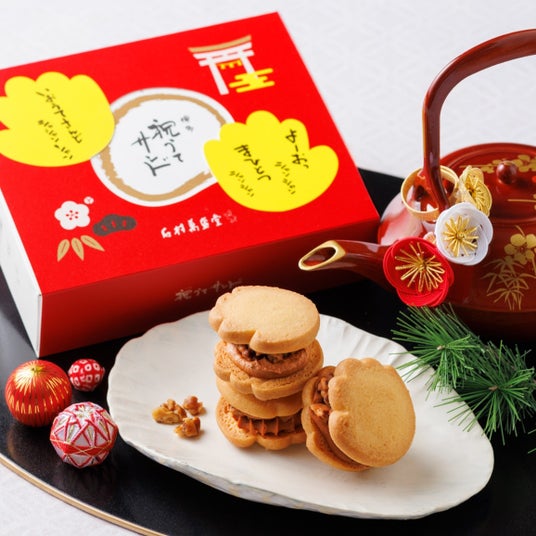 『祝うてサンド』は、サクサク香ばしい濃厚なキャラメルサンドです。最大の特徴は、食べた後の「後味のよさ」。キャラメル香料に一切頼らず、キャラメルが焦げすぎないよう、職人が丁寧に火加減を調節しています。これがキャラメル本来の甘さとほろ苦さを感じるオリジナルの味となり、甘ったるさが残らないのです。キャラメリゼしたくるみのカリカリとした食感と、2 層のキャラメルクリームを、厳選したバターを贅沢に使ったかわいい手形のクッキーでサンドしました。濃厚なキャラメルクリームとクッキーのサクサク感が絡み合うお菓子です。