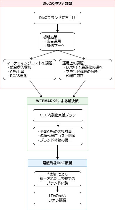 そこで、WEBMARKSでは様々な企業のSEO内製化を支援してきた実績と経験を元に、DtoC事業者専用のSEO内製化支援プランを提供し、DtoC事業者のWebマーケティング全体における中長期的なCPA改善とブランディングの両立を実現する支援を実施することを決定いたしました。