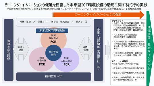 福岡教育大学では、附属学校3拠点においてフューチャークラスルームを活用した学習指導方法の開発と実践および検証を目的とした、「ラーニング・イノベーションの促進を目指した未来型ICT環境設備の活用に関する試行的実践」の取り組みを進めています。本プロジェクトでは、フューチャークラスルームの活用実践を段階的に深め、教育の質を高めることを目的としております。