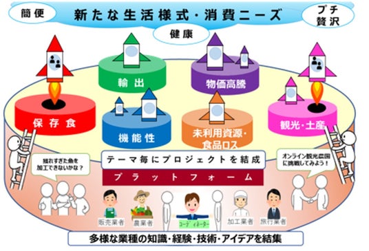 宮崎県の強みである農林水産業の高付加価値化に向けた取組を推進するため、食と農に関する多様な関係者が参画し、各々の知見・経験・技術等を結集する“みやざきLFPプラットフォーム”を設置しました。特徴は、食品関連に限らず幅広い業種の事業者が参画していることで、令和6年11月30日時点で277 事業者(農林漁業者、加工・販売業者、観光業者、大学、地域商社など)が入会しています。県内の数多くの事業者が共通の課題を持つことでより効率的にプロジェクトに参加できるよう、 “有機”、“未利用資源・食品ロス”、“保存食”、“香り”、“輸出”、“観光・土産”、 “物価高騰”などテーマで分科会を作り、それぞれ関心があるテーマ毎に事業者が集まり、ワークショップを通じて新たなビジネス創出に向けた意見交換を行いながら、プロジェクトチームを結成していきます。下図のように分科会の各テーマはロケットの発射台に例えられ、各チームで地域課題の解決と経済性の両立に向けて、プロジェクト(ロケット)に取り組み、ビジネスの創出(発射)を目指しています。今後は、各プロジェクトから生み出された新商品やサービスが事業者の所得向上や雇用の創出、交流人口の増加など価値連鎖を生むことで、地域経済の活性化を目指しています。