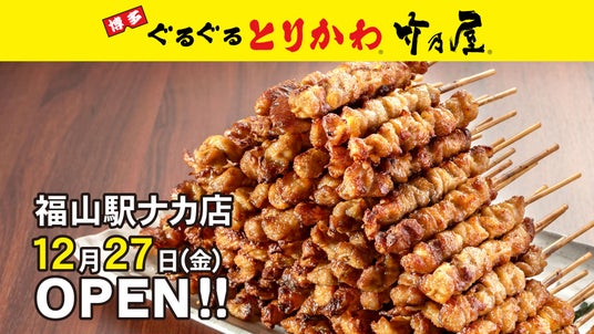 株式会社タケノ(本社:福岡市博多区博多駅南、代表:竹野孔)は、『博多ぐるぐるとりかわ 竹乃屋 福山駅ナカ店』を、2024年12月27日(金)10時にグランドオープンいたします。竹乃屋グループ人気の「博多ぐるぐるとりかわ」と「博多もつ鍋」をお楽しみいただけます。