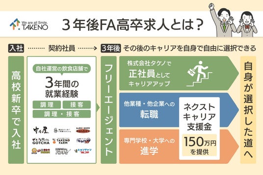 この新たな求人制度は、高校新卒者がタケノ入社後、自社運営の飲食店舗で3年間の就業を経