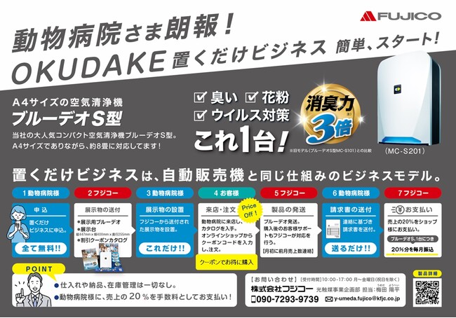 犬や猫と一緒に暮らす部屋を、光触媒で消臭・除菌する空気清浄機『ブルーデオ』の製造販売を手掛ける株式会社フジコー(本社:福岡県北九州市、代表取締役社長:萩尾 寿昭 以下フジコー)は2024年11月19日(火)、動物病院向けビジネスモデル『OKUDAKEビジネス』の専用サイトをオープンしました。動物病院内にブルーデオと割引クーポン付きカタログを設置し、来院者が当該クーポンを使ってネットからブルーデオを購入するたびに病院側に収益が発生します。商品発送や代金回収、アフターサービス等はメーカーサイドで行いますので、面倒な販売手続きや在庫保管は不要です。