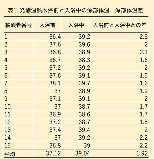 また、15 分の時間を目安にした場合、サウナは+0.5°C、お風呂の入浴は+1°C程度といわれる中、発酵温熱木浴は15 分の入浴で深部体温が平均+2°Cになることが今回の試験により実証できました。