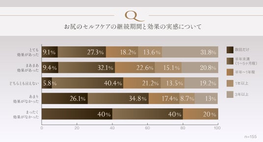 ただ一方で、セルフケアの継続期間と効果の実感についての回答を照らし合わせると、「3年以上継続した人」では“とても効果があった”と答えた人が約3割、「数回のみ」で終了した層では“まったく効果を感じなかった”人が4割を占めました。