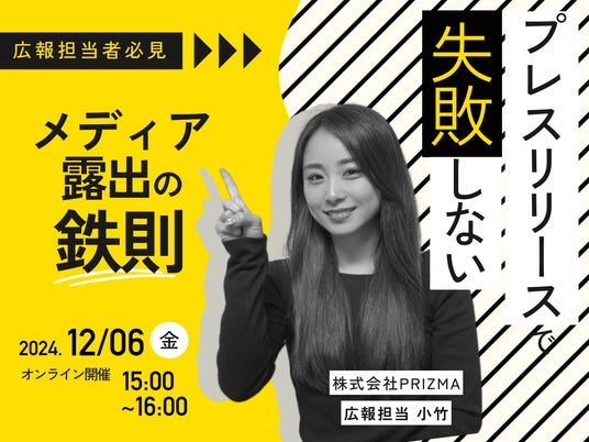 https://www.prizma-link.com/)は、2024年12月6日(金)15:00-16:00に『プレスリリースで失敗しない”メディア露出の鉄則”』と題するオンラインセミナーを開催いたします。
