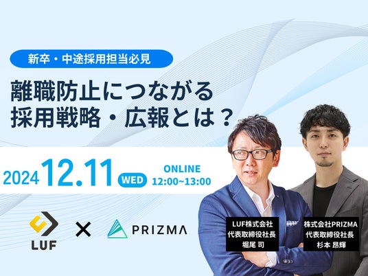 https://www.prizma-link.com/)は、LUF株式会社(本社:東京都港区、代表取締役社長:堀尾 司)と共催で、2024年12月11日(水)12:00-13:00に『離職防止につながる採用戦略・広報とは?』と題するウェビナーを開催いたします。