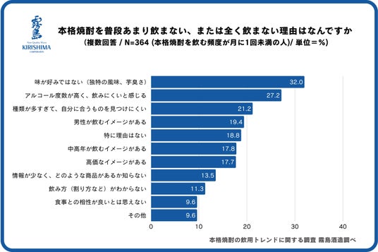 本格焼酎を飲む頻度が月に1回未満の方に本格焼酎を飲まない理由を質問したところ、1位「味が好みではない(独特の風味、芋臭さ)」(32.0%) 、2位「アルコール度数が高く、飲みにくいと感じる」(27.2%)、3位「種類が多すぎて、自分に合うものを見つけにくい」(21.2%)という結果になりました。
