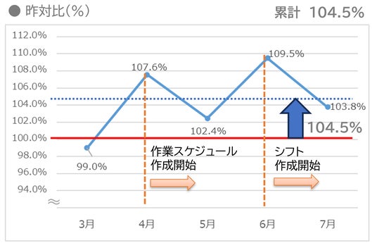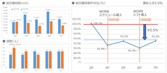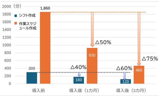 ロッキーでは従来、勤務計画の作成を店長が手作業で行っており、勤務シフト作成は300分/月、作業スケジュール作成は1,860分/月もの時間を要していました。このように時間をかけて作成した勤務計画でも、必要人時に基づいた計画になっていない、現場は計画にはない”暗黙のルール”で作業を行っている、忙しい日・余裕がある日にムラがあるなどの課題がありました。そこで2024年3月よりロッキーが運営する熊本市内のスーパーマーケット2店舗においてテスト運用を実施。結果、勤務シフト作成時間を60%削減、作業スケジュール作成時間を75%削減しました。また「sinops-WLMS WORK」で作成したシフト、作業スケジュールに基づいた店舗運営を実施した結果、店舗の稼働人数は同条件であるにもかかわらず、総労働時間は昨年対比6.5%(累計)短縮され、人時売上高は昨年対比4.5%(累計)向上しました。