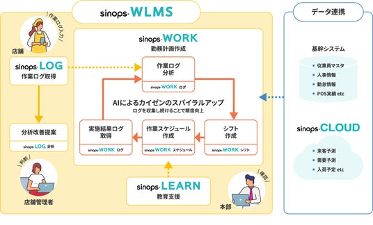 「sinops-WLMS WORK」は、スーパーマーケットをはじめとした小売業やサービス業向けに、勤務シフト・作業スケジュールをAIが自動作成するサービスです。各従業員の勤務要件に加え、作業ログから解析した店舗従業員の稼働状況や業務スキルを考慮し、最適な勤務シフト・作業スケジュールを作成します。他sinops製品と連携することで、商品の入荷予定や来客予測などに基づいた店舗の稼働予測も考慮可能です。作業スケジュールは日別に15分単位で作成され、従業員は勤務中、スマートフォンに表示される指示に従って作業の開始を登録します。作業完了時には、終了登録を行うことで、作業の実施状況や進捗がログとして記録されます。作業ログを記録・収集することで、計画した作業の実施有無や、作業時間と品質のバランス、店舗間・担当者間の格差など、店舗運営の現状や課題を把握できます。さらに、収集した作業ログをもとにAIが作業時間や人員の過不足といった実績を学習し、より実態に即した計画を作成します。このようなサイクルにより、作業のムダ・ムラ・ムリを改善しながら、計画精度の向上を図る「カイゼンのスパイラルアップ」が実現します。