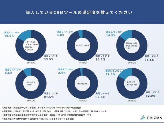 また、導入されているCRMツールの中では、「eセールスマネージャーRemix CLOUD」「Sales Cloud」「Microsoft Dynamics 365」が上位を占めていますが、満足度の高いツールとしては「HubSpot」「Sales Cloud」「Mazrica Sales」が挙げられました。
