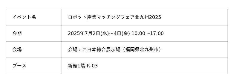KiQ Roboticsは2025年7月2~4日に開催される「ロボット産業マッチングフェア北九州2025」にブース出展し、「柔軟指」をご紹介します。柔軟指本体はもちろん、デモ機なども用意しておりますので、ぜひブースにお立ち寄り頂けますと幸いです。