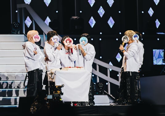 アンコールではメンバーが白パーカーに着替え、本編よりも少しリラックスした空気のパフォーマンス。サプライズでケーキが登場しみんなでりうらの誕生日を祝ったほか、曲中も手をつないで回ったり、肩を組みながら花道を歩いたりと、思い思いにこの瞬間を楽しんでいた。「ずっと一緒にいような」という初兎のセリフや、「Irregular Story」「君のために生まれてきた」の曲調も相まって、クライマックスへの熱量が高まっていく。