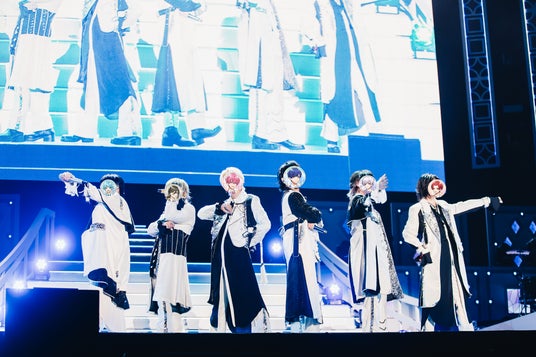 2日目は開演時間が1時間早いこともあり、外の明るさが入ってきて、これまで屋内ライブのみだったいれいすとしては新鮮な雰囲気だ。6人がステージに登場し、黒のマントを揺らしながら板付きする様子までよく見える。開演後はまふまふ書き下ろしの武道館ライブリード曲「星降るフェアリーテイル」、いれいすの第2章スタートを彩った「Promise」、初のアニメタイアップ「Brave」と、メモリアルソングが続く。ないこ&If、-hotoke-&初兎、悠佑&りうらがそれぞれ背中を預け合う様子や、<I Promise>で全員が小指を差し出す仕草に、改めて心を強く揺さぶられた。