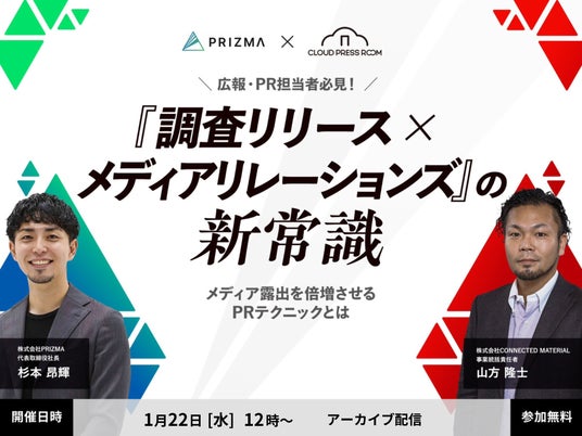 企業のPR支援プロダクト「PRIZMA」ブランドを展開する株式会社PRIZMA(https://www.prizma-link.com/)は、企業とメディアをつなぐ広報・PR支援サービス「CLOUD PRESS ROOM」を運営する株式会社CONNECTED MATERIAL(本社:東京都港区、代表取締役社長:河野 貴浩)と共催で、2025年1月22日(水)12:00-13:15に、前回大好評を博したウェビナー【『調査リリース×メディアリレーションズ』の新常識】の再配信を行います。