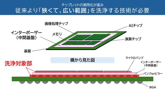 狭い隙間に残っているフラックスも効果的に洗浄することができ、次世代半導体の生産性向上に貢献します。