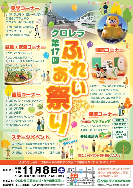 お近くの方、「筑後産クロレラ」にご興味のある方、ぜひこの機会に九州筑後工場にお立ち寄りいただき、クロレラ・ふれあい祭りをお楽しみください。