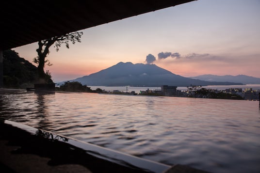 桜島と鹿児島市街地を一望する「展望露天温泉 さつま乃湯」の圧倒的な眺望。早朝の朝日、日中の雄大さ、夜景のきらめきなど、時間によって移ろう景色が高い評価。