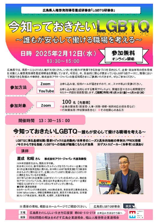 広島県では、県民一人ひとりの人権が大切にされ、いきいきと能力が発揮できる社会づくりを目的として、企業・自治体等の担当者様を対象に人権啓発指導者養成研修会を開催しています。今回は、今、社会的に関心が高まっているLGBTQをテーマに、職場において実践できる取組みや事例を、株式会社アウト・ジャパンの屋成和昭さまにご講演いただきます。
