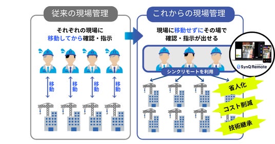 建設業界では、熟練技術者がトラブル解決や検査、指導のために現場に行くことが日常化しており、そのたびに移動時間とコストが大きな負担となっています。「SynQ Remote(シンクリモート)」は、現場の映像をリアルタイムで共有しながら、遠隔で具体的かつ的確な指示を可能にするコミュニケーションツールです。熟練技術者が現場に足を運ぶことなく、事務所や自宅から複数の現場を支援できるため、移動時間をゼロにする新たな働き方を実現します。これにより、業務効率の向上や作業のスピードアップが可能となり、建設業界の未来を切り開く基盤を築いています。