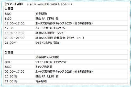 スカパー! は、12 月 20 日(金)17 時より国内旅行「鷹 BAKA 軍団と行く!福岡ソフトバンクホークス 宮崎春季キャンプ 2025 応援ツアー」を発売いたします。 当商品は福岡ソフトバンクホークスの春季キャンプ地が開催 される、生目の杜運動公園(宮崎県宮崎市)を目的地とした 1 泊 2 日のバスツアーです。