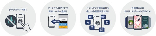 「QUICK TRIP Ticket」は、各事業者・エリア専用かつダウンロード不要のWEBアプリを提供し、乗車券や施設入場券をはじめとしたチケットをデジタル化して発行・販売・管理するシステムです。ソーシャルログイン(Google、Facebook、Apple、Amazon)に対応するとともに、7言語(日本語・英語・中国語(簡体・繁体)・韓国語・ベトナム語・タイ語・インドネシア語)での表示に対応しており、アプリごとに使用する言語を選ぶことができます。