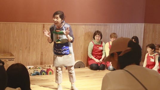 あそびの案内人「おもちゃ学芸員」さんたちが協力して作ったエプロンを使って飛んでったバナナの「エプロンシアター」を館内で親子に披露している様子。
