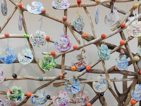 「波絵馬」は、対馬島内で回収されたペットボトルキャップを素材に、金沢美術工芸大学がデザインした海の神『おとーしゃ』を象ったアップサイクル絵馬です。海洋汚染によって弱々しく小さな姿になってしまった『おとーしゃ』の元の美しく豊かな姿を取り戻すことをミッションに、参加者はこの波絵馬に海への願いを記入し、願掛け処に展示します。