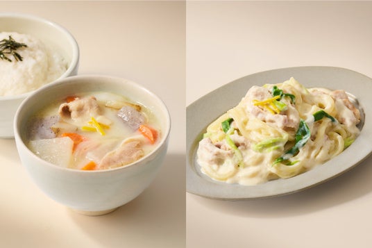 [左から]ゆず香る具沢山白みそ豚汁セット、九条ねぎと豚肉の白みそクリームうどん