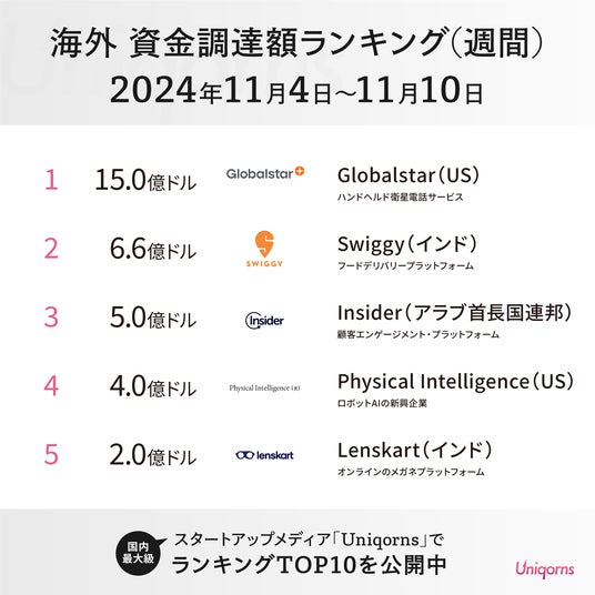 国内最大級のスタートアップメディア「Uniqorns(ユニコーンズ)」(運営:株式会社エモリューションクリエイティブ 本社:福岡市、代表取締役:松石 圭介)が発表した2024年11月4日~11月10日の海外スタートアップ資金調達ランキングでは、Appleから15億ドルの大型調達を実施した衛星電話サービスのGlobalstar(米国)が首位に。2位には主要金融機関から6.6億ドルを調達したインドのフードデリバリープラットフォームSwiggy、3位にはジェネラル・アトランティックから5億ドルを調達したアラブ首長国連邦の顧客エンゲージメントプラットフォームInsiderがランクイン。今週は、通信インフラやデジタルプラットフォームなど、生活に密着したサービスを提供するスタートアップが上位を占める結果となりました。