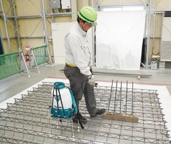 従来、コンクリート打設時、鉄筋にコンクリートが付着した場合、バケツと洗車ブラシを使用して、付着したコンクリートの清掃作業を行っていました。屈んだ体勢での作業が続くため、作業者の負担が大きいという問題を抱ていました。また使用する水量の調節が困難なため、コンクリート打設時における品質管理上の懸念もありました。
