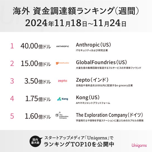 株式会社EmolutionCreative国内最大級のスタートアップメディア「Uniqorns(ユニコーンズ)」が海外2024年11月18日~11月24日のスタートアップ資金調達状況をランキング形式で発表