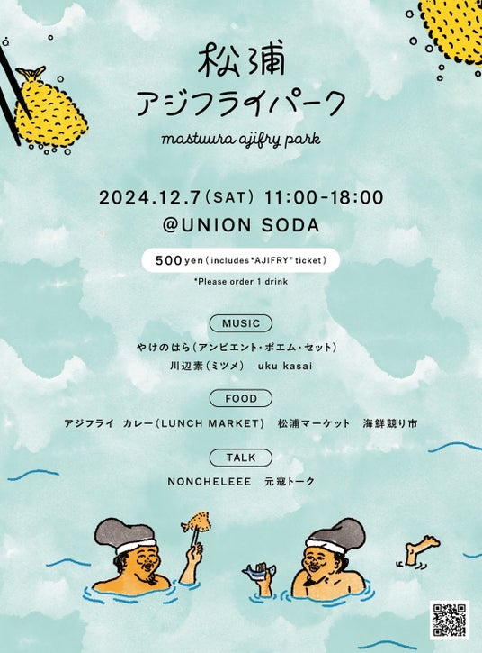 LOVE FM注目アーティストによる音楽ライブや、多彩な松浦コンテンツをお楽しみいただけます。入場料は500円(アジフライ付き)。別途ワンドリンクのご注文が必要です。