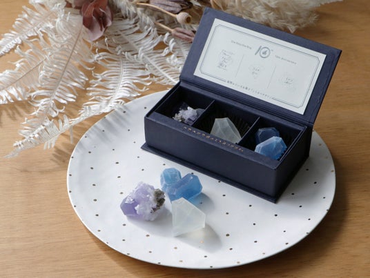 砂糖と寒天から作られる和菓子の琥珀糖に、鉱物や宝石のイメージを加えて、アート作品のように作り出されるお菓子です。石の美しい佇まいを思い描きながら、職人の手でひとつひとつ切り出されており、同じものはない唯一無二の仕上がりがithのジュエリーにも通ずる魅力を持ちます。