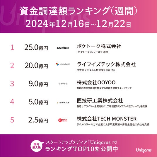 国内最大級のスタートアップメディア「Uniqorns(ユニコーンズ)」(運営:株式会社エモリューションクリエイティブ 本社:福岡市、代表取締役:松石 圭介)が発表した2024年12月第3週の資金調達額ランキングでは、世界79言語に対応する翻訳機「ポケトーク」シリーズを展開するポケトーク株式会社が25億円を調達し、1位にランクインしました。続く2位には、次世代デジタル人材育成のライフイズテック株式会社が20億円を調達。また、製造業のDX化を推進する匠技研工業株式会社が4位にランクインするなど、多様な分野のスタートアップ企業の資金調達が活発化しています。本レポートでは、12月16日から22日までの期間における国内スタートアップの資金調達状況を詳しく分析していきます。