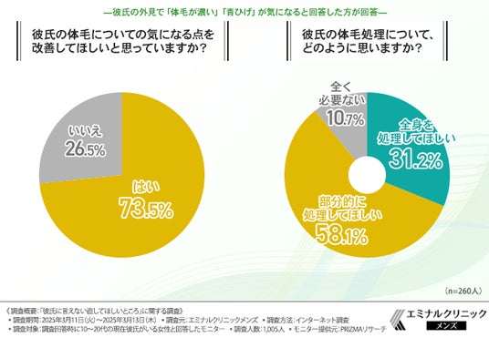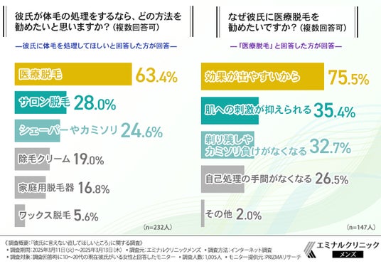 また、7割以上の女性が「彼氏の体毛を改善してほしい」と考えており、約9割が何らかの処理を望んでいることが判明しました。特に「医療脱毛」を推奨する声が多く、その理由として「効果が出やすい」「肌への刺激が少ない」「カミソリ負けがなくなる」といった点が挙げられました。