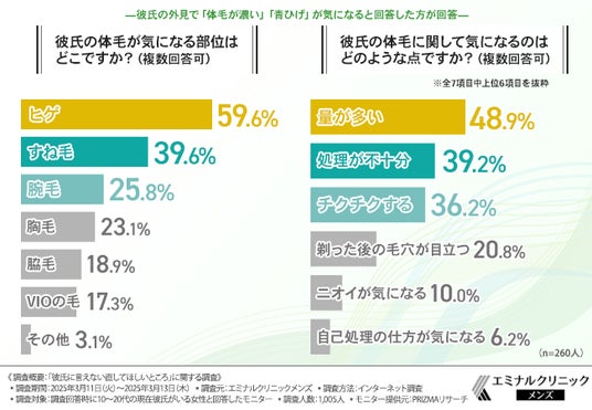 続いて「彼氏の体毛に関して気になるのはどのような点ですか?(複数回答可)」と質問したところ、