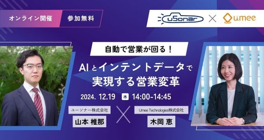 新人からトップセールスを輩出するコネクテッドセールス・プラットフォーム*「Front Agent」を開発・提供するUmee Technologies株式会社(本社:東京都調布市、代表取締役:新納 弘崇、以下「ユミー」)と日本最大級の法人データベースサービスを提供するユーソナー株式会社(本社:東京都新宿区、代表取締役会長:福富 七海、代表取締役社長:長竹 克仁、以下「ユーソナー」)は、12月19日(木)14:00 - 14:45に共催オンラインセミナー「自動で営業が回る!AIとインテントデータで実現する営業変革~売上アップを達成したABMとインテントのセールスサイクル実例」を開催いたします。