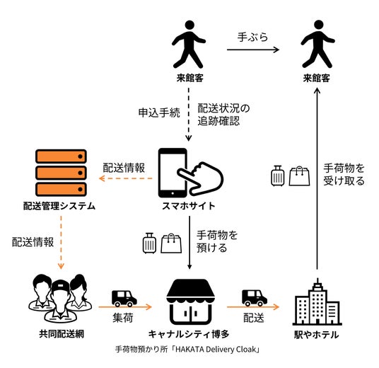 株式会社エニキャリ株式会社エニキャリ(以下、エニキャリ)は、株式会社FJアーバンオペレーションズ(以下、FJアーバンオペレーションズ)と提携し、2024年12月1日から九州有数の大型複合商業施設「キャナルシティ博多」内の手荷物預かり所「HAKATA Delivery Cloak」にて、来館者向け手荷物預かり・配送サービスの実証実験を開始します。本実証実験は、手荷物や購入品を当日中に博多・天神エリアのホテルまたはJR博多駅へ配送します。多言語対応の専用スマホサイトを活用し、インバウンドをはじめとする観光客の利便性向上と手ぶら観光による地域経済への貢献が期待できます。
