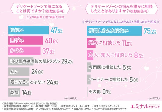 「デリケートゾーンで気になることは何ですか?(複数回答可)」と質問したところ、