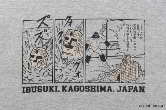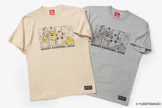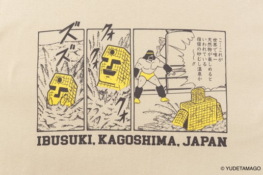 Tシャツは、サンシャインの焼酎ラベルのコミックデザインを「IBUSUKI」の文字とともに配して、指宿をさらに身近に感じていただけるアイテムとして製作しています。サンドベージュとミックスグレーの2カラー展開。