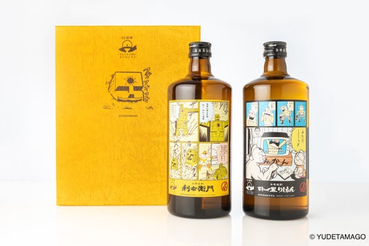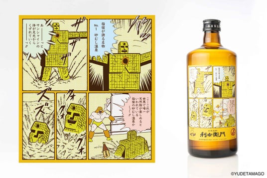 指宿酒造の代表銘柄「利右衛門(りえもん)」と「あわせ黒りえもん」の薩摩焼酎の特別ラベルとして、指宿が誇る観光資源を題材に、「キン肉マン」コミックのコマデザインをアレンジした特別ラベルに仕上げています。
