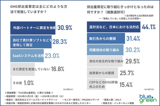 株式会社エスプール『温対法などの法対応』や『取引先からの要請』がきっかけとなりGHG排出量算定に取り組んでいる企業が多数
