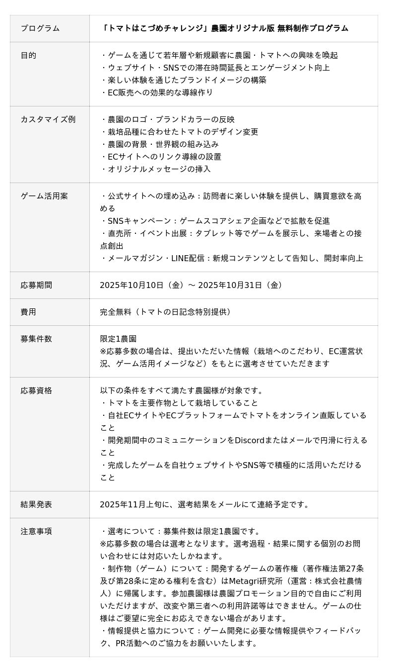 さらに、本ゲームの公開を記念し、オンラインでトマトを直販されている農園様限定で、農園の魅力を詰め込んだオリジナル版ゲームを無料で制作する特別コラボレーション企画を開始いたします。