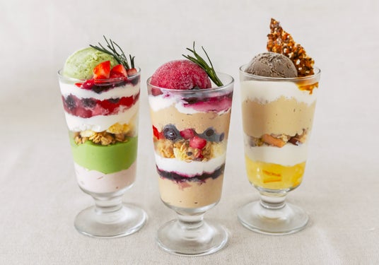 左から「いちごとピスタチオのパフェ」「ミルクティーとブルーベリーのパフェ」「ほうじ茶とゆずのパフェ」